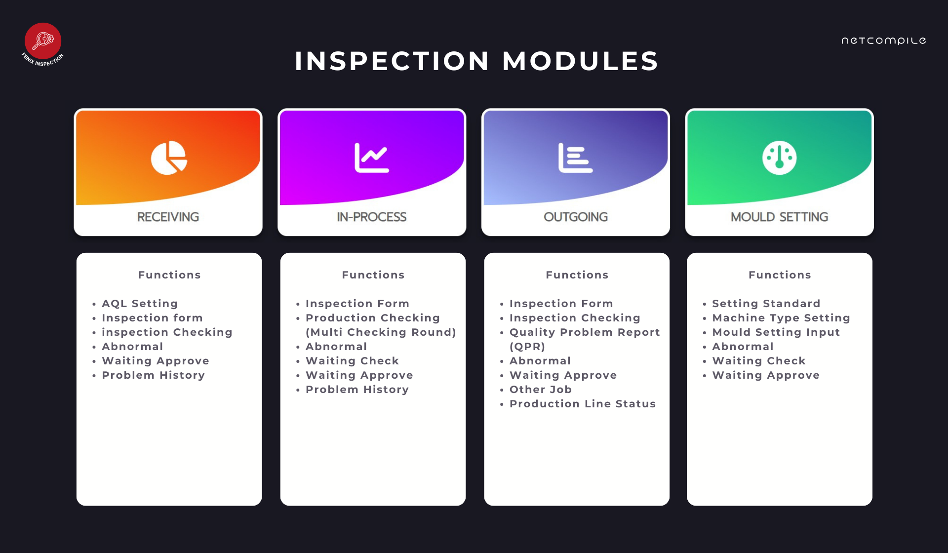 ระบบบันทึกข้อมูลการตรวจสอบคุณภาพชิ้นงาน ได้พัฒนาขึ้นมาอย่างครอบคลุม รองรับการทำงานตรวจสอบคุณภาพชิ้นงานในทุกฝ่าย ไม่ว่าจะเป็นฝ่ายตรวจสอบคุณภาพ หรือฝ่ายผลิต สามารถทำการบันทึกข้อมูลตั้งแต่การตั้งค่าเครื่องจักร คุณภาพชิ้นงานระหว่างผลิต ไปจนถึงคุณภาพชิ้นงานก่อนส่งมอบให้กับลูกค้า สามารถจัดการข้อมูลชิ้นงาน ลูกค้า ไลน์การผลิต รวมถึงสร้างและจัดการแบบฟอร์มที่ใช้ในการบันทึกข้อมูลได้อย่างสะดวกง่ายดาย ด้วยการทำงานที่ยืดหยุ่นของระบบ ปรับปรุงให้เหมาะสมกับการใช้งานหน้างานมากที่สุด