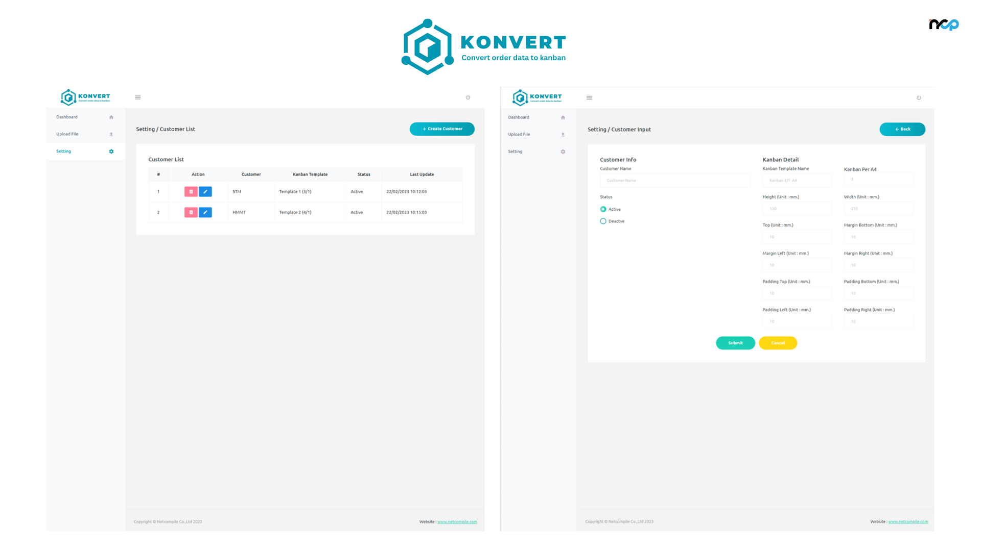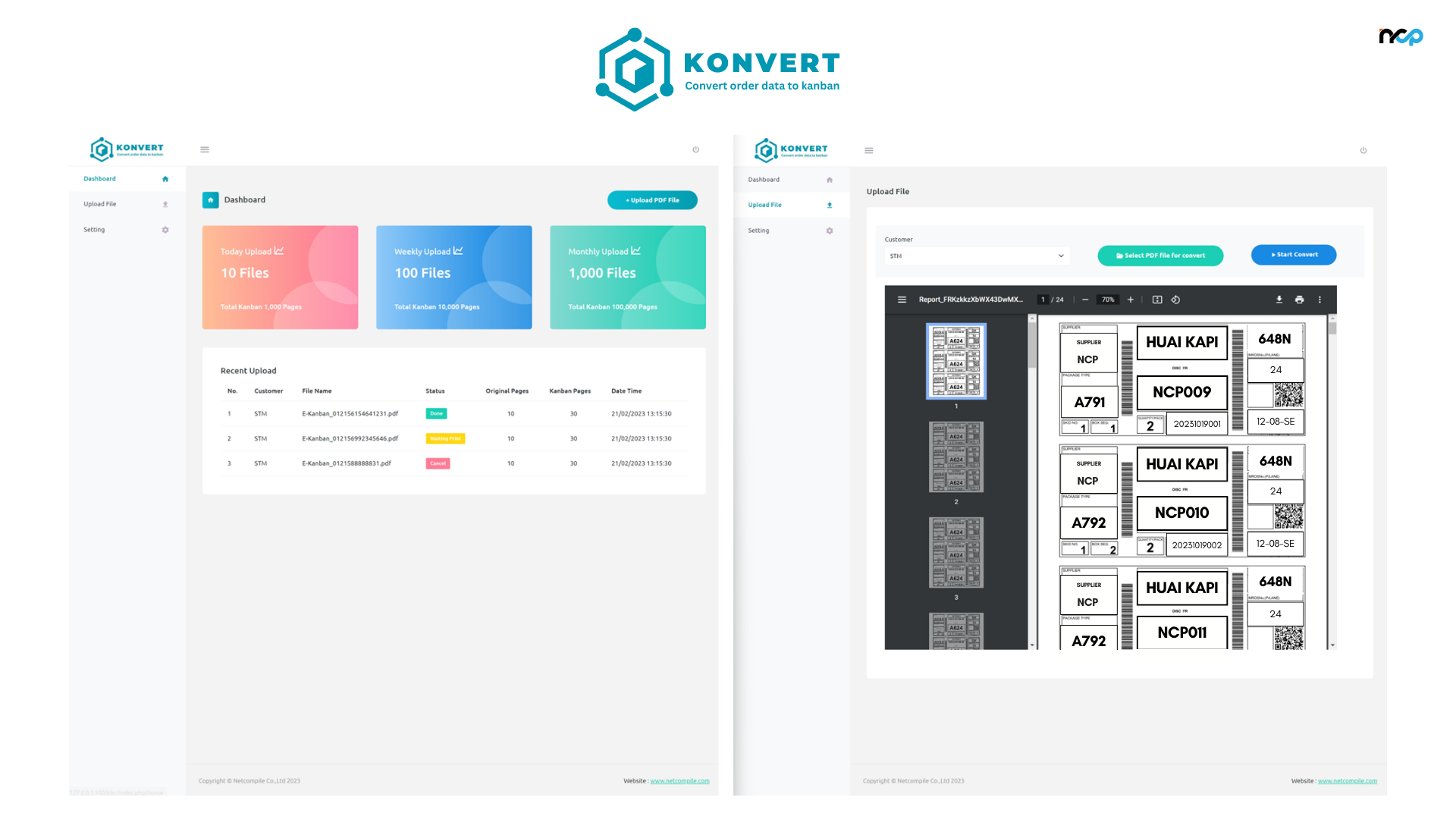 ระบบแปลงรูปแบบคัมบัง (Kanban Convert: Konvert) มีหลักการทำงานโดยระบบจะอ่านไฟล์ออร์เดอร์สินค้าจากรูปแบบเอกสาร PDF จากนั้นจำแนกว่าหน้าใดเป็นคัมบัง (kanban) หรือหน้ารวมข้อมูลคั่นออร์เดอร์ (skid) และแปลงเป็นไฟล์แยกแต่ละคัมบังที่พร้อมสำหรับการพิมพ์ออกมาใช้งาน ลดระยะเวลาการทำงาน ลดความยุ่งยากในการเตรียมคัมบังสินค้า ให้การทำงานในขั้นตอนนี้สำเร็จอย่างง่ายดาย รวดเร็ว เพียงแค่การคลิก!