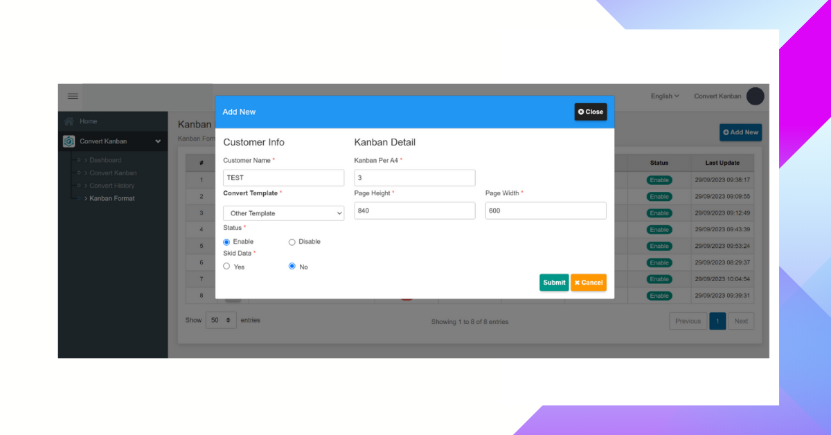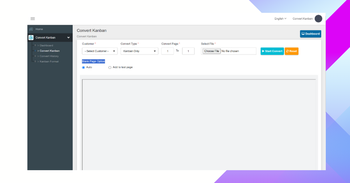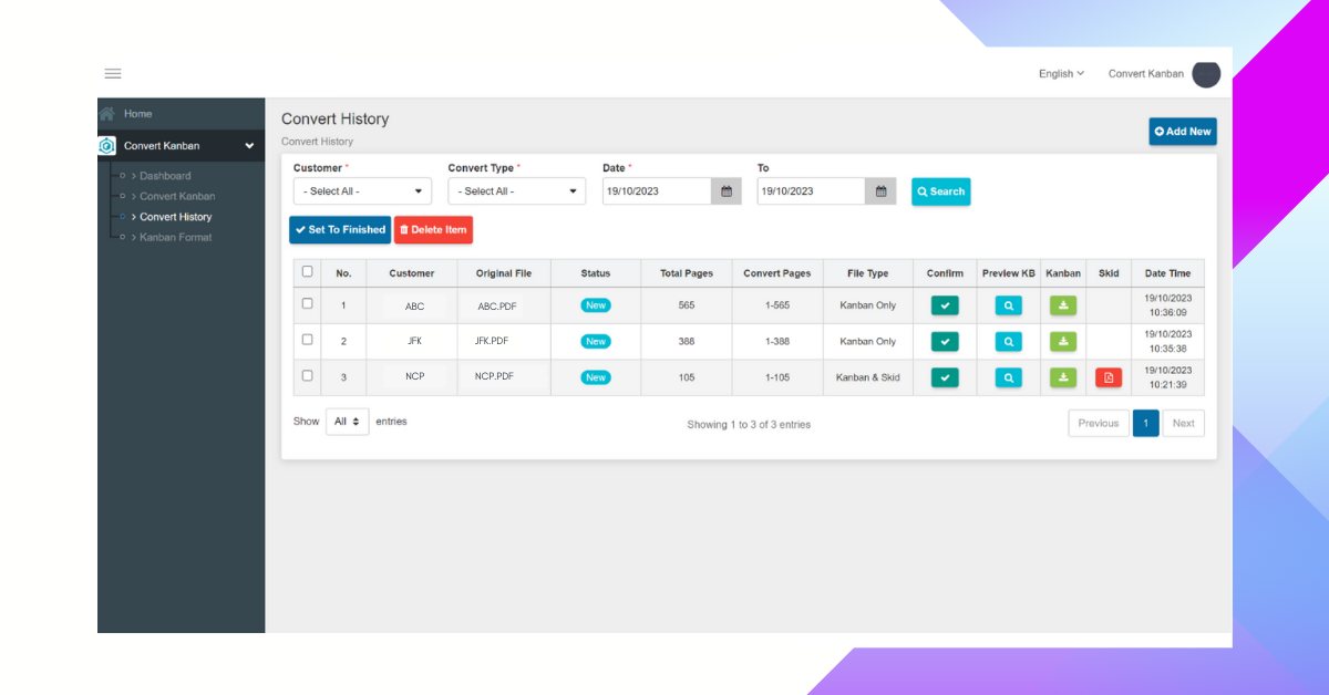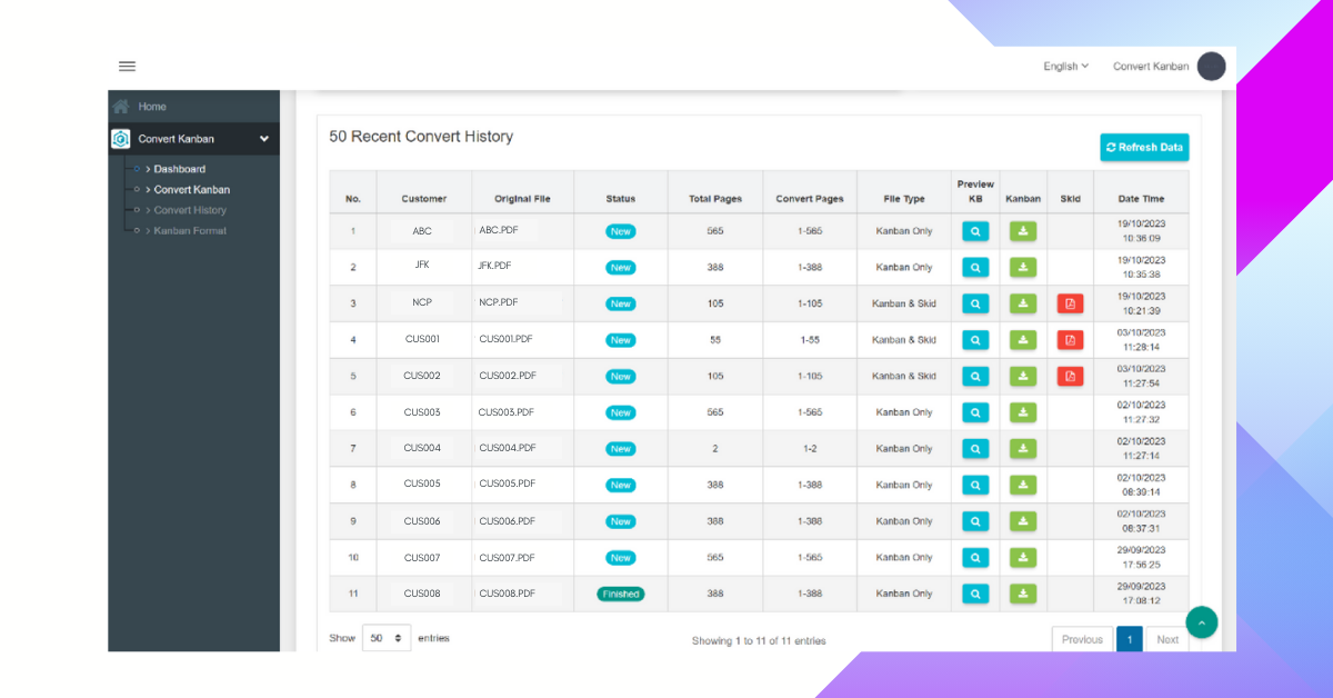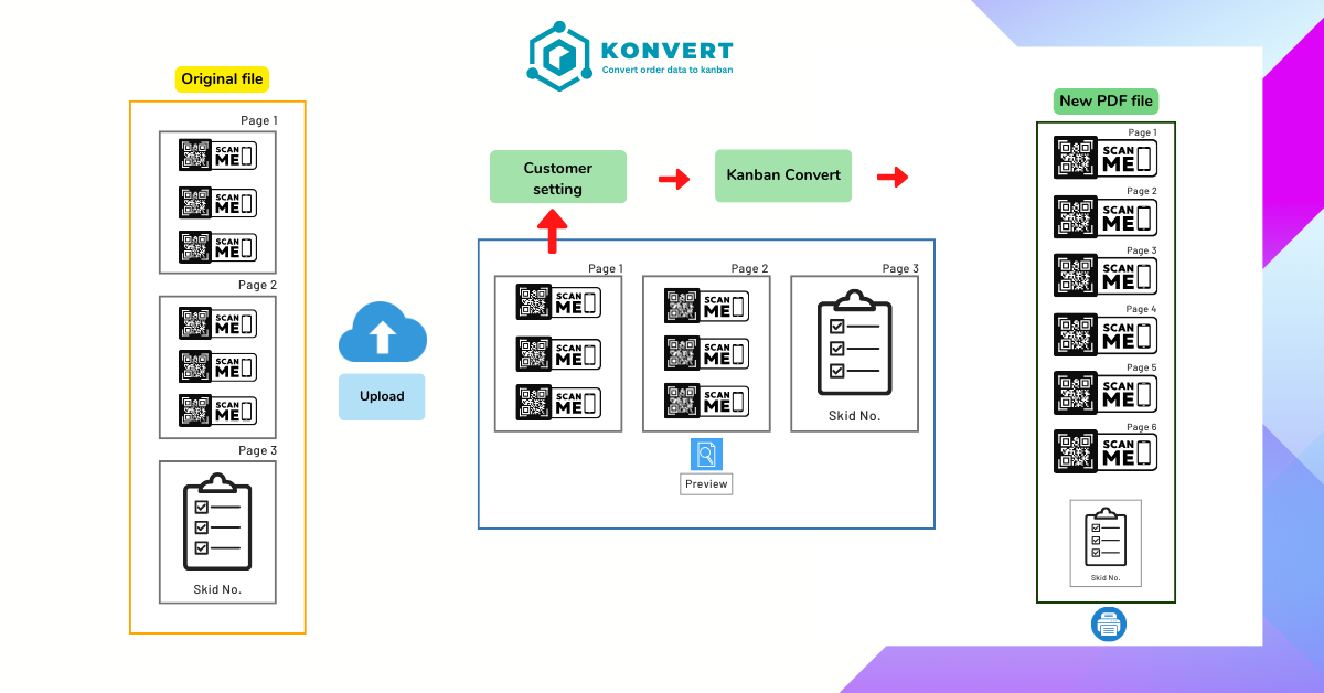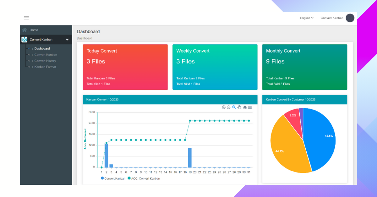 ระบบแปลงรูปแบบคัมบัง (Kanban Convert: Konvert) มีหลักการทำงานโดยระบบจะอ่านไฟล์ออร์เดอร์สินค้าจากรูปแบบเอกสาร PDF จากนั้นจำแนกว่าหน้าใดเป็นคัมบัง (kanban) หรือหน้ารวมข้อมูลคั่นออร์เดอร์ (skid) และแปลงเป็นไฟล์แยกแต่ละคัมบังที่พร้อมสำหรับการพิมพ์ออกมาใช้งาน ลดระยะเวลาการทำงาน ลดความยุ่งยากในการเตรียมคัมบังสินค้า ให้การทำงานในขั้นตอนนี้สำเร็จอย่างง่ายดาย รวดเร็ว เพียงแค่การคลิก!